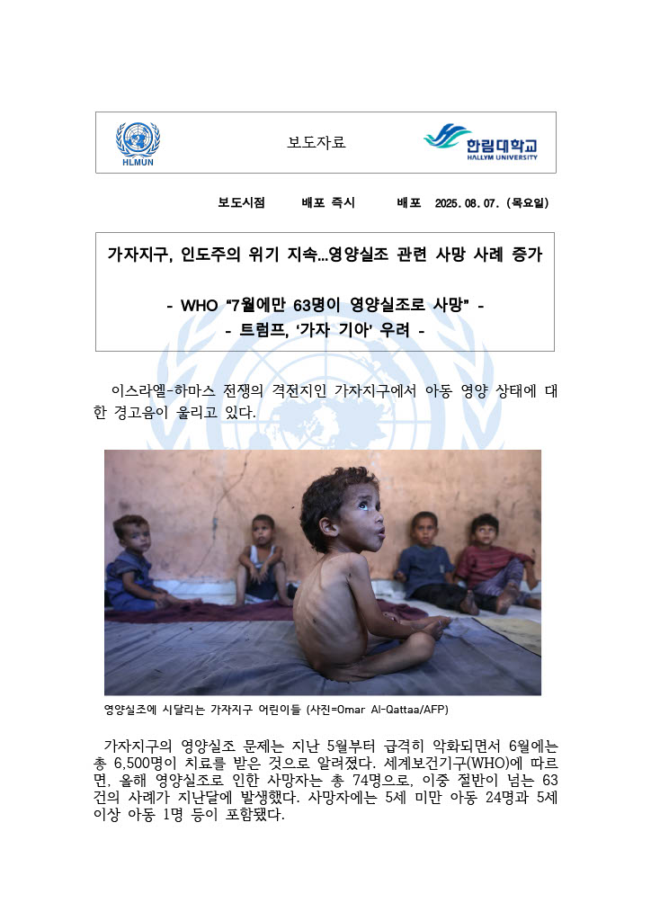 가자지구 인도주의 위기 지속 영양실조 관련 사망 사례 증가