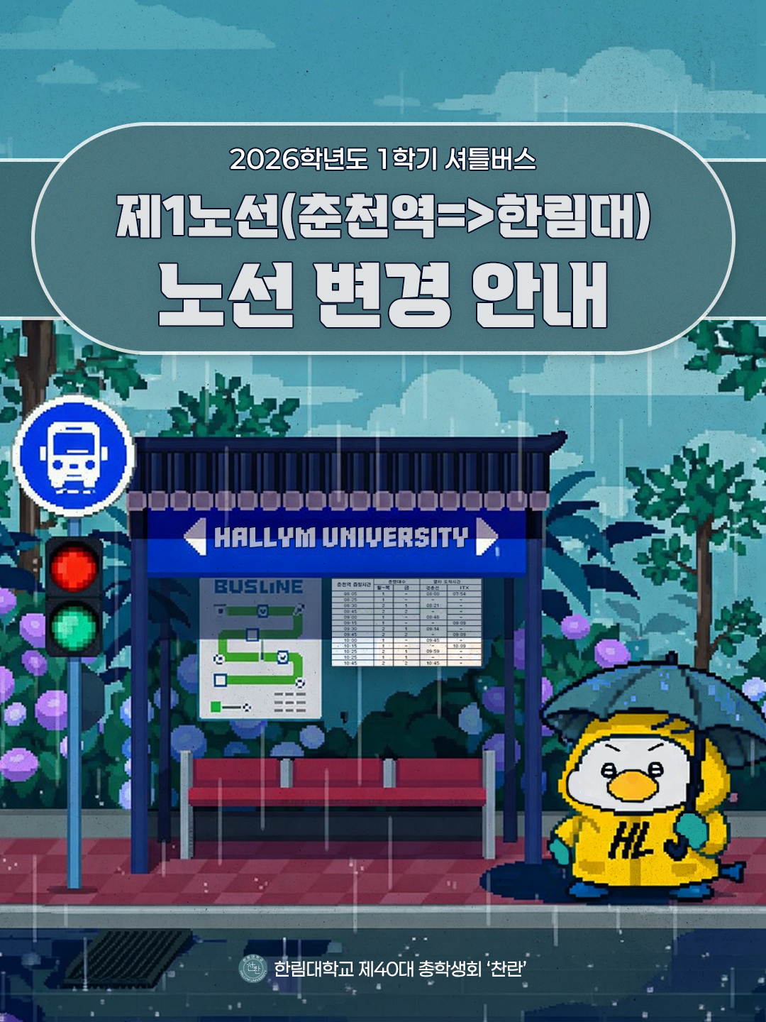 경춘선 도착시간 변경에 따라 2026학년도 1학기 셔틀버스 제1노선(춘천역 ⇒ 한림대학교) 운행 노선이 변경되어 안내드립니다.