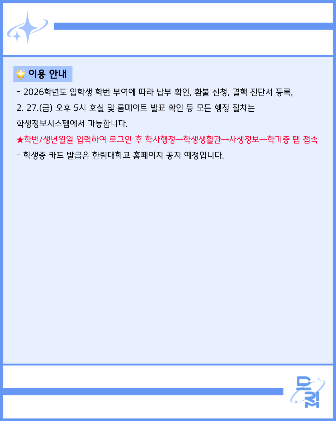 - 2026학년도 입학생 학번 부여에 따라 납부 확인, 환불 신청, 결핵 진단서 등록, 2. 27.(금) 오후 5시 호실 및 룸메이트 발표 확인 등 모든 행정 절차는 학생정보시스템에서 가능합니다.