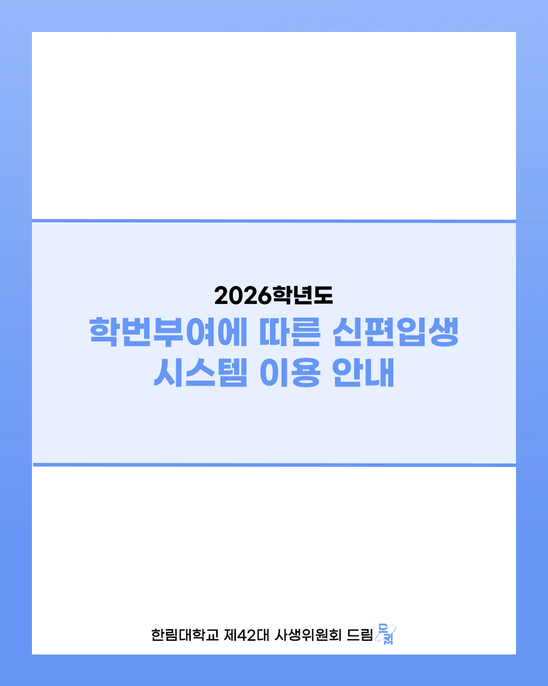 안녕하십니까, 2026학년도 제42대 사생위원회 '드림'입니다. 2026학년도 학번 부여에 따른 시스템 이용을 안내드리오니 참고하여 주시길 바랍니다.