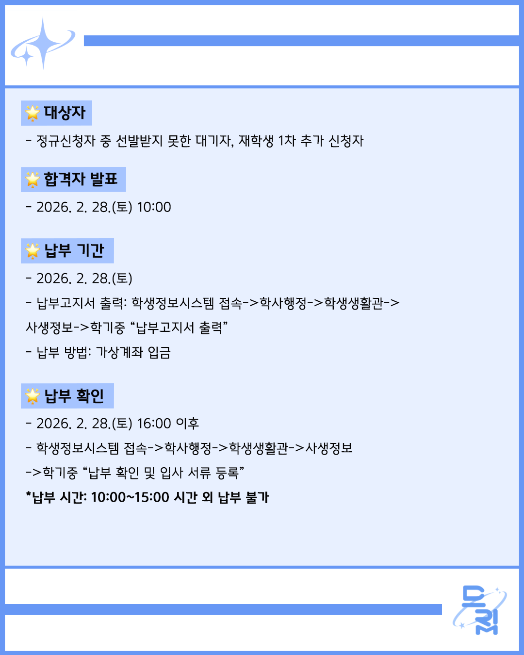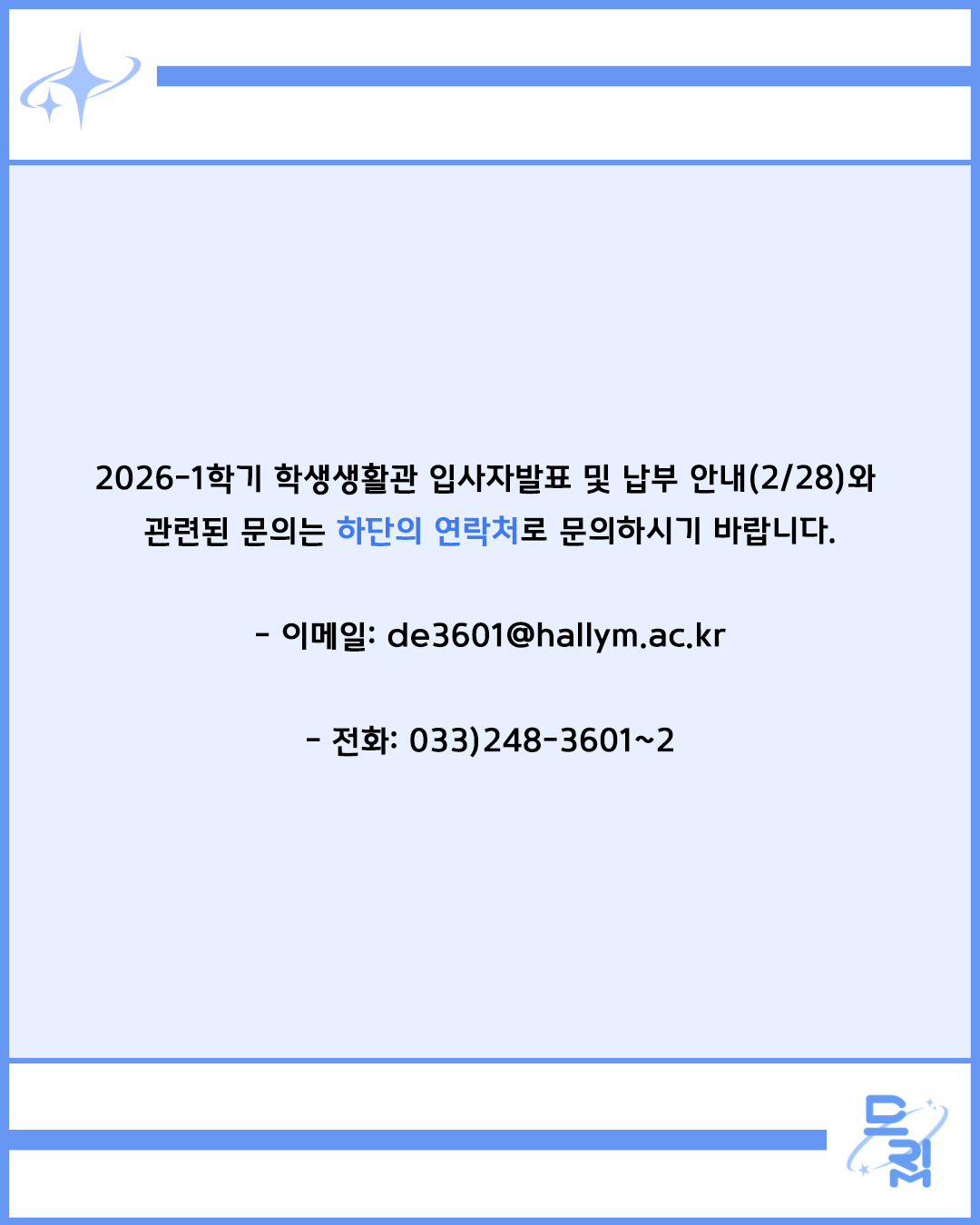 🌟2026-1학기 학생생활관 입사자발표 및 납부 안내(2/28)와 관련된 문의는 하단의 연락처로 문의하시기 바랍니다.