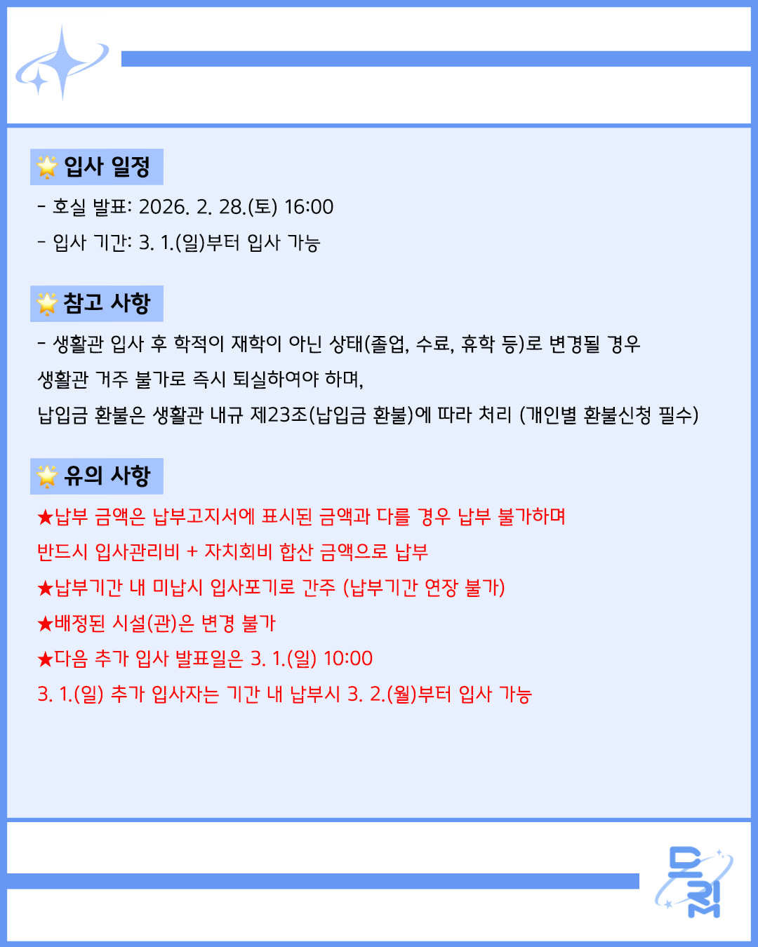02.28.(토)에 2026학년도 1학기 학생생활관 추가 입사자 발표 및 납부가 진행됩니다. 기숙사 입사를 희망하시는 학우 여러분들께서는 본 게시물 및 하단의 카드뉴스를 참고하시기 바랍니다.