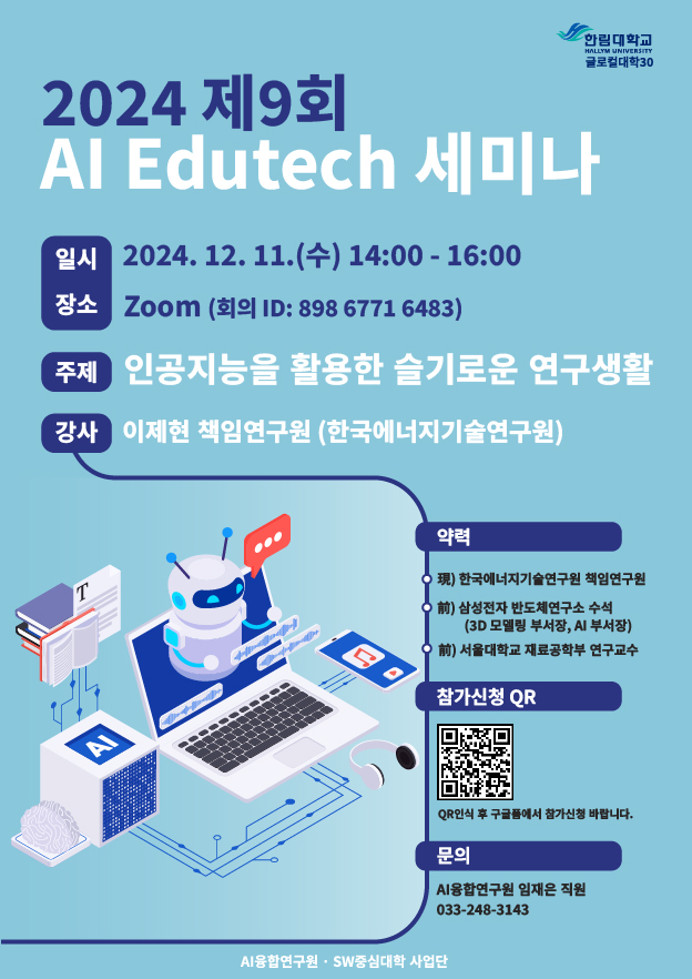 교내 구성원 여러분께서 연구 과정에 생성형 AI가 어떻게 도움을 줄 수 있는 지에 대한 아이디어를 얻을 수 있는 세미나이오니 많은 참여 부탁드리며,