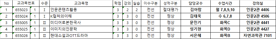 2025학년도 2학기 인문콘텐츠융합전공 개설 교과목 및 수강 관련으로 아래와 같이 안내드립니다.