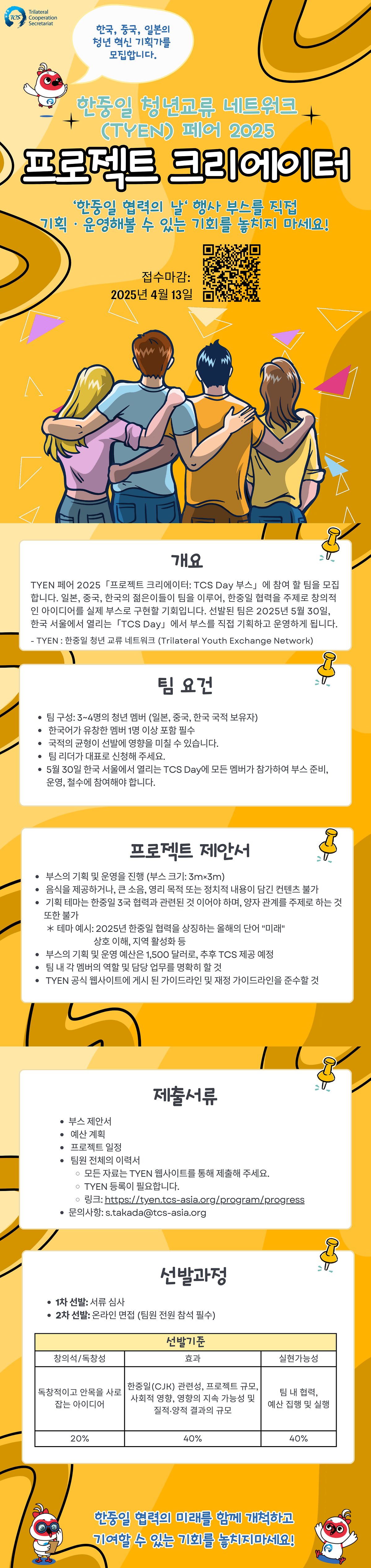 * 테마 예시: 2025년 한중일 협력을 상징하는 올해의 단어 "미래" 상호 이해, 지역 활성화 등 부스의 기획 및 운영 예산은 1,500 달러로, 추후 TCS 제공 예정 팀 내 각 멤버의 역할 및 담당 업무를 명확히 할 것 TYEN 공식 웹사이트에 게시 된 가이드라인 및 재정 가이드라인을 준수할 것