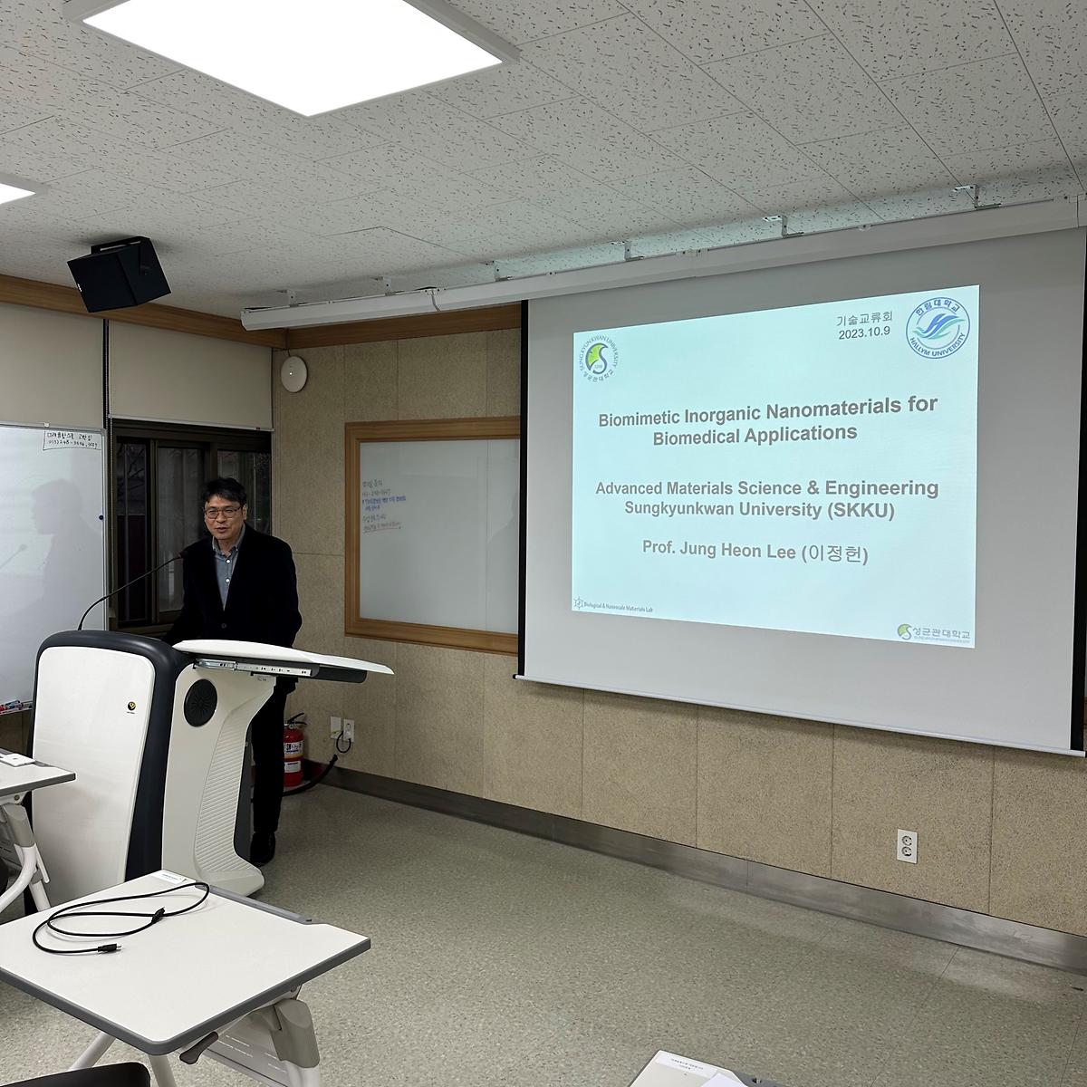 이번 강연회는 성균관대학교 신소재공학부 이정헌 교수를 연사로 모시고 '생물 유래 기능성 나노 소재의 합성과 응용'을 주제로 강연이 진행되었다.