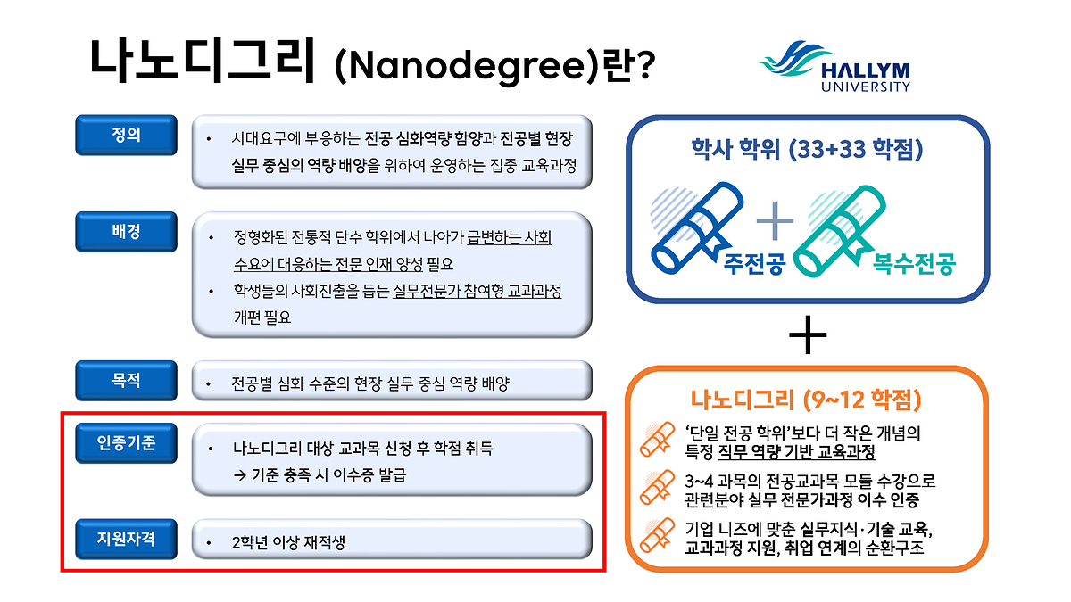 나노디그리 (nanodegree)는 단일 전공 학위보다 더 작은 개념의 특정 직무 역량 기반 교육과정으로, 산업 현장의 니즈에 맞춘 실무지식과 기술을 3~4과목의 전공교과목 모듈 수강으로 공인 받을 수 있는 교육과정입니다.