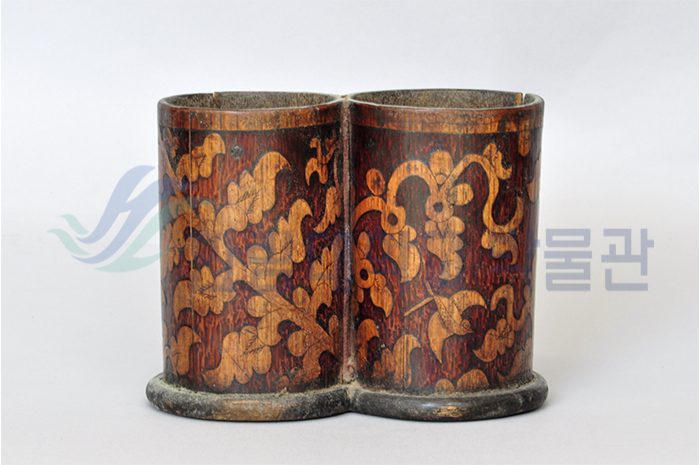 붓을 꽂을 수 있도록 만든 필통입니다. 대나무 두 개를 연결하고 바닥에 나무판을 대어 만들었습니다, 대나무의 몸통에는 화조문이 양각되어 있습니다.