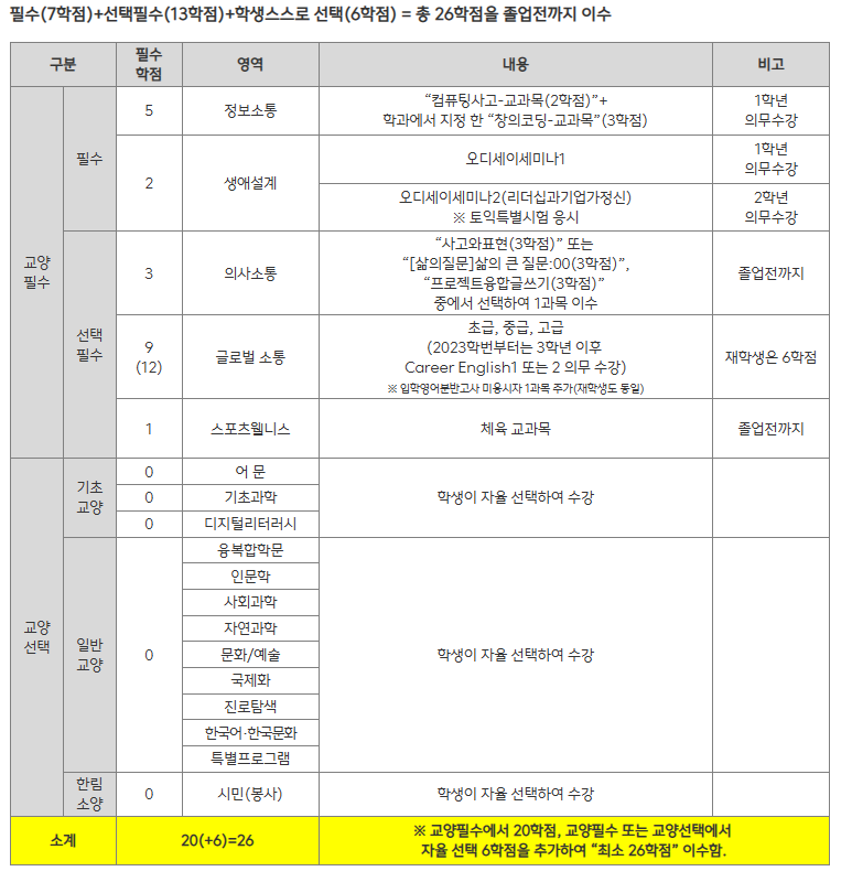 2) 2023학번 이후~: 학생이 스스로 “교양필수 또는 교양선택”에서 선택하여 6학점 이상 추가로 이수해야 졸업이 가능함.