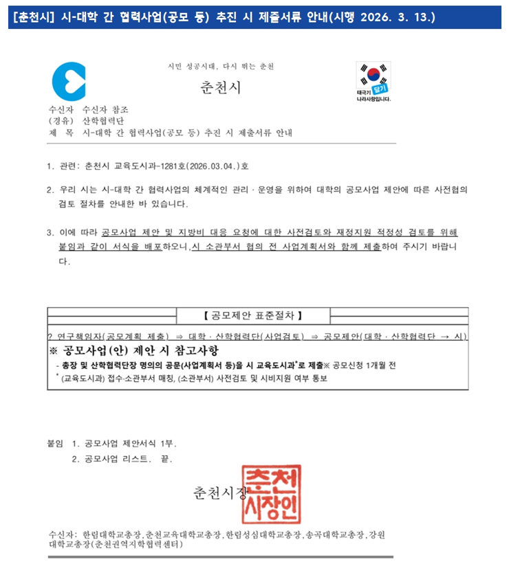 산학협력단을 신청·협약 주체로 하는 공모사업 제안 및 지방비 대응 요청 시 안내된 표준절차에 따라 반드시 산학협력단을 경유하여 주시기 바랍니다.