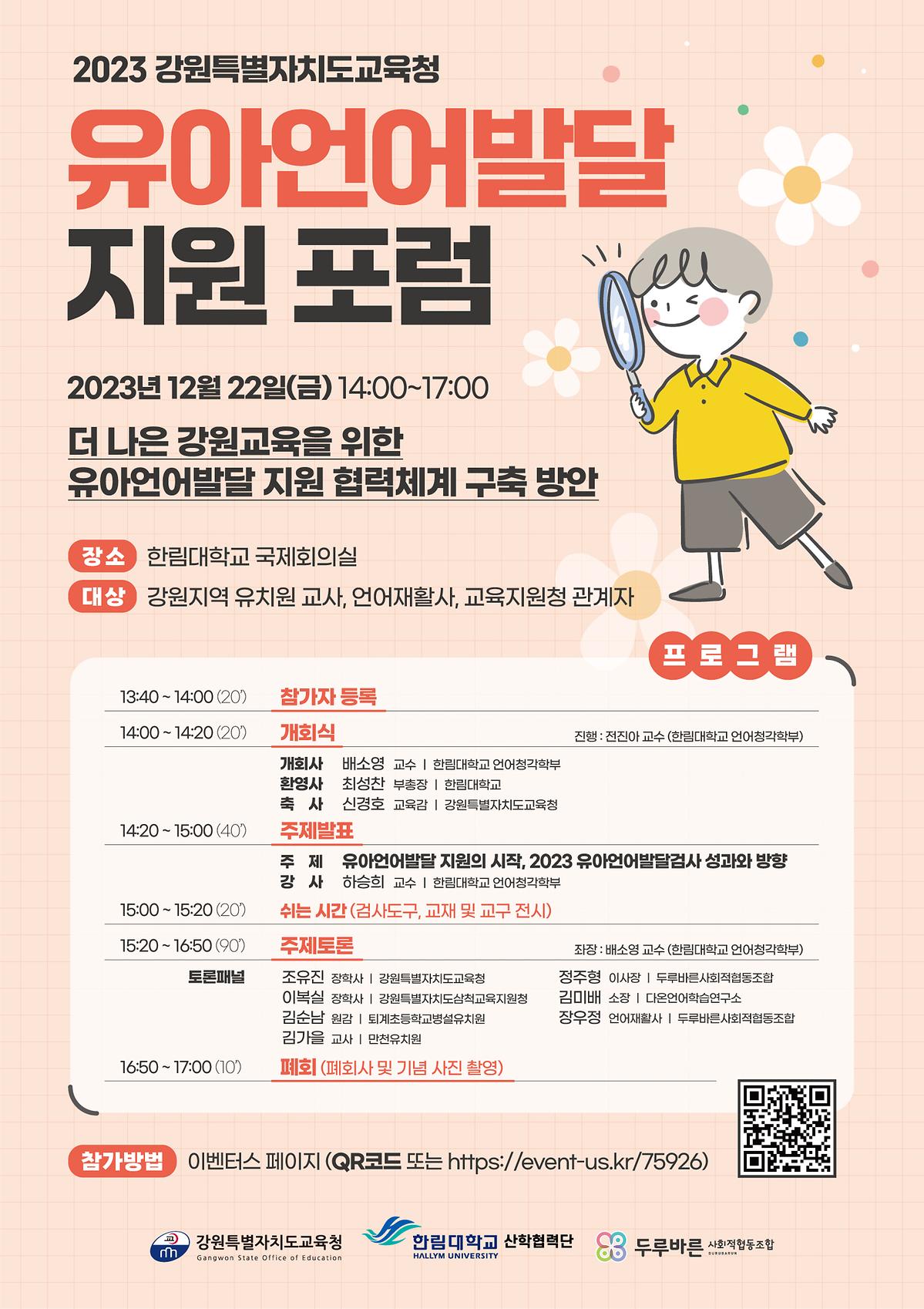 ◦ 포럼은 △한림대학교 언어청각학부 하승희 교수의 ‘유아언어발달 지원의 시작, 2023 유아언어발달검사 성과와 방향’에 대한 주제발표에 이어, △조유진 장학사(강원특별자치도교육청) △이복실 장학사(강원특별자치도삼척교육지원청) △김순남 원감(퇴계초등학교병설유치원) △최유선 교사(홍천남산유치원) △정주형 이사장(두루바른사회적협동조합) △장우정 언어재활사(두루바른사회적협동조합)가 주제토론을 펼칩니다.