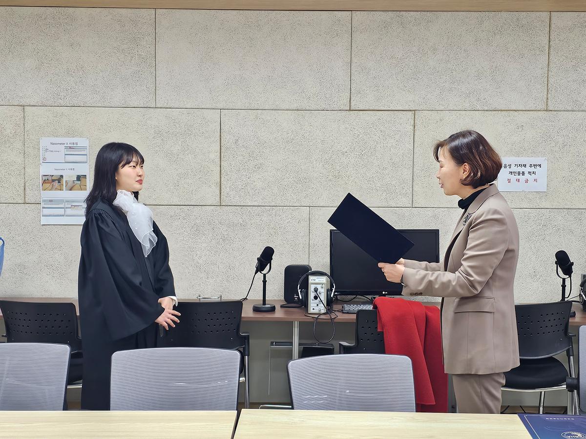 두 학생은 언어병리학 교육과정을 성실하게 이수하여 표창장을 수상하게 되었습니다.