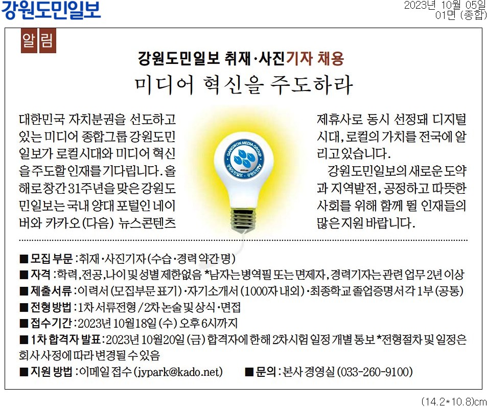 대한민국 자치분권을 선도하고 있는 미디어 종합그룹 강원도민일보가 로컬시대와 미디어 혁신을 주도할 인재를 기다립니다.