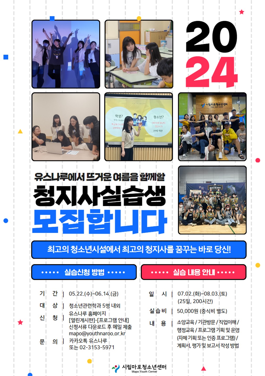 - 2024년 하계방학을 맞이하여 청소년관련학과 전공자 대상 전문적·체계적 교육을 통해 이해의 폭을 넓히고 건강한 예비청소년지도사로 성장할 수 있도록 현장 실습과정을 진행하고자 합니다.