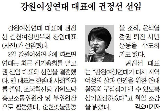 [강원일보] / 권정선(사회학과 95학번) 동문 / 강원여성연대 대표에 권정선 선임 / 20260303 / 인물 21면