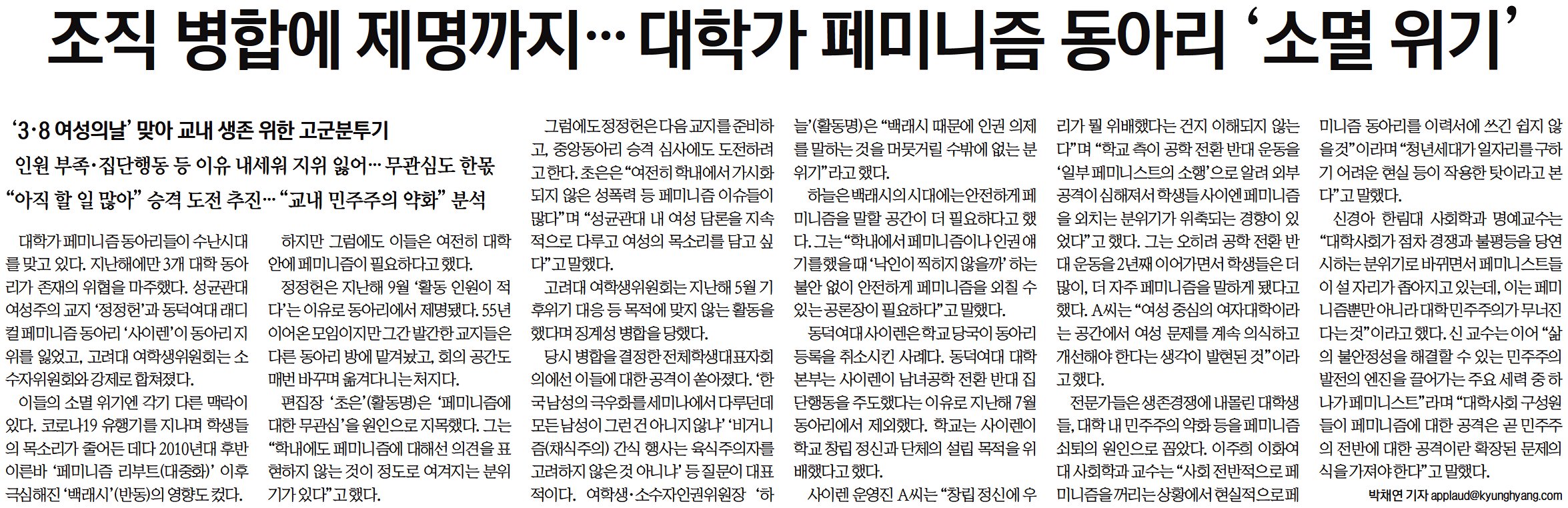 [경향신문] 신경아 명예교수님 / 조직 병합에 제명까지…대학가 페미니즘 동아리 '소멸 위기' / 20260309 / 사회 10면