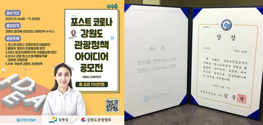 포스트 코로나 시대 강원도의 관광 발전을 위한 참신하고 실질적인 정책 제안을 보여 주는 것이 핵심 내용이며 ‘이연수, 조인영’ 학생은 ‘강원도 캠핑카 관광 상품 개발 추진 사업’을 제안하여 포스트코로나 시대 변화하는 관광 트렌드를 잘 반영한 전략으로 평가받으며 우수상을 수상하였다.