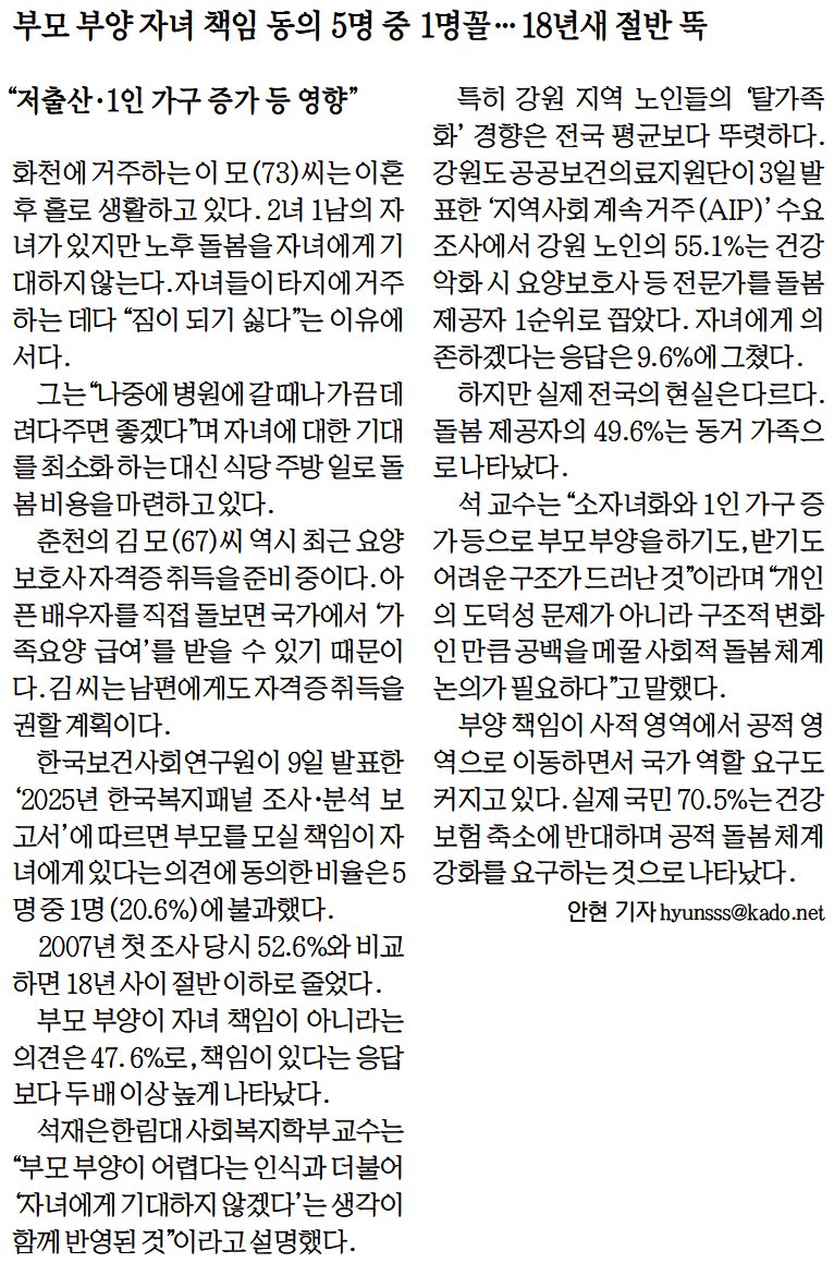 부모 부양 자녀 책임 동의 5명 중 1명꼴…18년새 절반 뚝