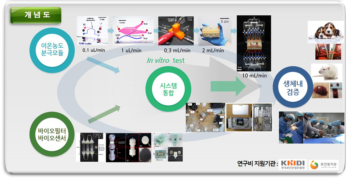 - 말기신부전 환자의 생존을 위한 혈액투석과 복막투석의 단점인 다량(1일 4시간 주 3회, 1회당 물 200L 사용)의 물이나 장시간(일회당 2L 투석액 1일 4회 교환)의 정지 상태를 요하는 불편함을 해결하기 위하여, 나노-바이오 기술과 나노 채널의 이온농도분극 기술의 융합을 통한 휴대형 스마트 인공 신장 개발
